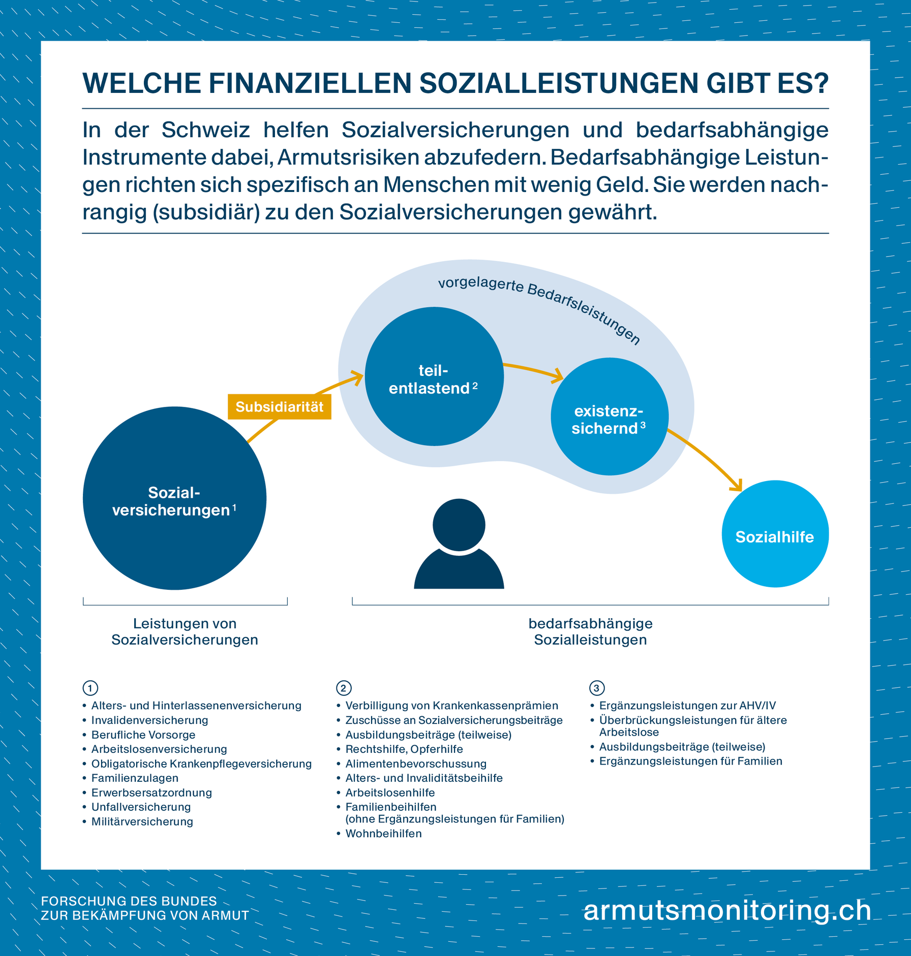 Der Sozialstaat der Schweiz ist mehrstufig aufgebaut. Wenn die individuelle Existenzsicherung durch Erwerbsarbeit oder Familienunterstützung nicht möglich ist, kommen Sozialleistungen zum Tragen: Sozialversicherungen bieten den Menschen Schutz vor Risiken wie Krankheit oder Arbeitslosigkeit. Bedarfsleistungen wie etwa Prämienverbilligungen ergänzen die Sozialversicherungen gezielt, wenn diese nicht ausreichen. Das letzte Auffangnetz ist die Sozialhilfe. Sie sichert das Existenzminimum.